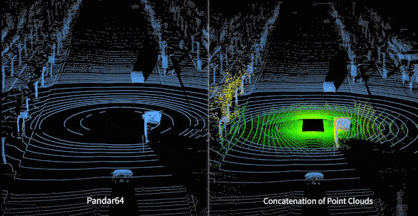 圖為:單一Pandar64點云(藍)與Pandar64(藍)+4個PandarQT(綠)拼接點云對比圖