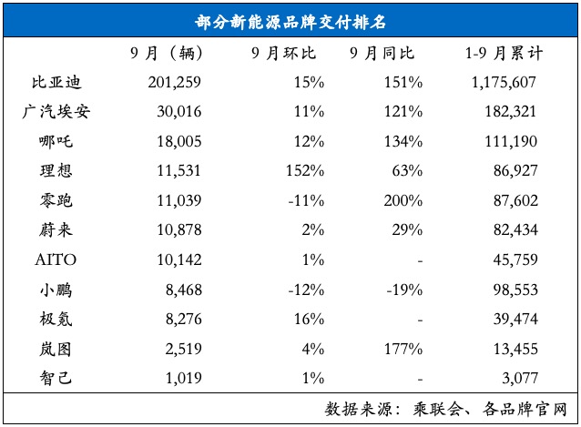 據(jù)乘聯(lián)會預(yù)計,9 月狹義乘用車零售銷量預(yù)計 195萬輛,同/環(huán)比分別增長 23.3%/ 4.2%;其中新能源零售銷量預(yù)計 58萬輛,同/環(huán)比分別增長 73.9%/ 9.5%,滲透率 29.7%,環(huán)比+1.4pcts。從新勢力銷量上看,各家新勢力品牌披露其9月交付量和前三季度累計交付量,多個品牌交付量單月銷量破萬,交付量環(huán)比提升明顯。部分?jǐn)?shù)據(jù)如下: