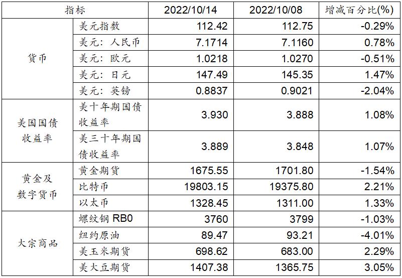 10月8日至10月14日,美元指數(shù)下降0.29%,而對其他全球主流貨幣匯率則互有漲跌。美國十年期及三十年國債收益率持續(xù)攀升,且仍然維持倒掛現(xiàn)象。黃金期貨價格下降,而比特幣和以太幣則分別錄得2.21%和1.33%的上漲表現(xiàn)。大宗商品當中,螺紋鋼和紐約原油價格下跌,而玉米和大豆期貨價格呈現(xiàn)上漲。