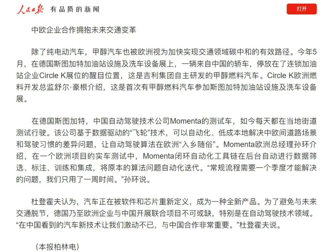 10月17日,《人民日報》國際版面刊發的“中國新能源汽車積極拓展歐洲市場”一文中,Momenta獨特的數據驅動“飛輪”技術路徑以及在歐洲市場取得的成績獲得《人民日報》關注報道。