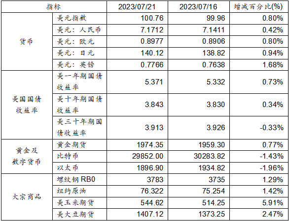 7月16日至7月21日,美元指數上漲0.80%,美元兌人民幣匯率上漲0.42%達到1:7.1712。美國一年期、十年期國債收益率上漲,三十年期國債收益率則呈現下跌態勢。黃金期貨價格上漲0.77%。比特幣下跌1.43%。以太幣下跌1.96%。大宗商品中,螺紋鋼、紐約原油、玉米期貨及大豆期貨價格均呈現上漲態勢。