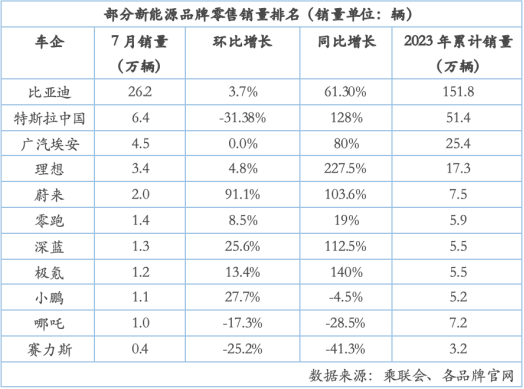 部分新能源品牌具體零售銷量如下: