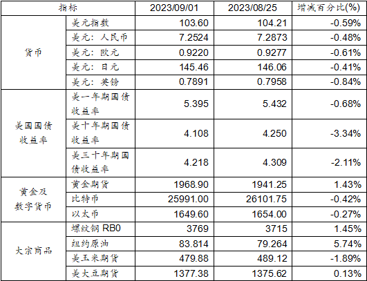 8月25日至9月1日,美元指數下跌0.59%,美元兌人民幣匯率下跌0.48%達到1:7.2524。美國一年期、十年期及三十年期國債收益率均出現下跌。黃金期貨價格上漲1.43%。比特幣下跌0.42%。以太幣下跌0.27%。大宗商品中,螺紋鋼、紐約原油及大豆期貨價格上漲,而玉米期貨價格則呈現下跌。