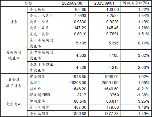 9月1日至9月8日,美元指數上漲1.22%,美元兌人民幣匯率上漲1.34%達到1:7.3493。美國一年期、十年期及三十年期國債收益率均出現上漲。黃金期貨價格下跌1.02%。比特幣上漲1.05%。以太幣下跌0.21%。大宗商品中,紐約原油及玉米期貨價格上漲,而螺紋鋼及大豆期貨價格則呈現下跌。