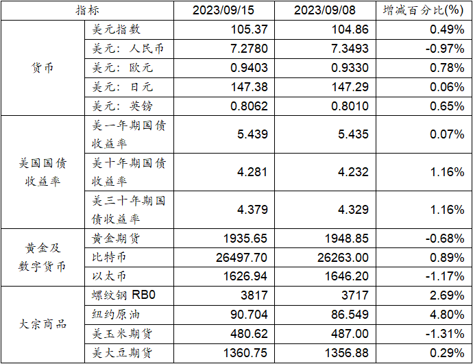 9月8日至9月15日,美元指數(shù)上漲0.49%,美元兌人民幣匯率下跌0.97%達(dá)到1:7.2780。美國一年期、十年期及三十年期國債收益率均出現(xiàn)上漲。黃金期貨價格下跌0.68%。比特幣上漲0.89%。以太幣下跌1.17%。大宗商品中,螺紋鋼、紐約原油及大豆期貨價格上漲,而玉米期貨價格下跌。