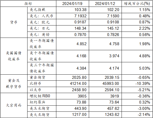 1月12日至1月19日,美元指數上漲1.15%,美元兌人民幣匯率上漲0.48%達到1:7.1932。美國一年期、十年期及三十年其國債收益率均上漲。黃金期貨價格下跌0.65%。比特幣下跌10.39%。以太幣下跌5.21%。大宗商品中,紐約原油價格上漲,而螺紋鋼、玉米期貨及大豆期貨價格則呈現下跌。