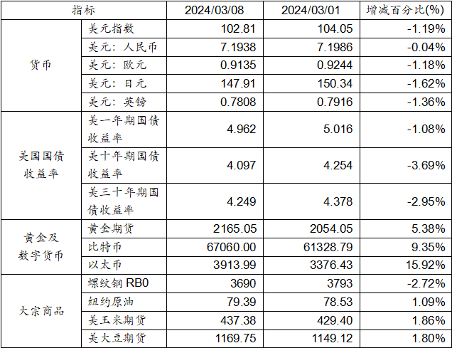3月1日至3月8日,美元指數下跌1.19%,美元兌人民幣匯率上漲0.04%達到1:7.1938。美國一年期、十年期及三十年期國債收益率均小幅下跌。黃金期貨價格上漲5.38%。比特幣上漲9.35%。以太幣大漲15.92%。大宗商品中,螺紋鋼價格下跌,而大豆期貨、紐約原油及玉米期貨價格呈現上漲態勢。