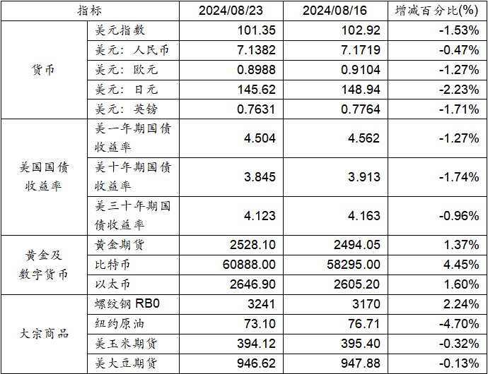 8月16日至8月23日,美元指數(shù)下跌1.53%,美元兌人民幣匯率下跌0.47%至1:7.1782。美國一年期、十年期及三十年期國債收益率呈現(xiàn)下跌態(tài)勢。黃金期貨價(jià)格上漲1.37%。比特幣上漲4.45%。以太幣上漲1.60%。大宗商品中螺紋鋼價(jià)格上漲,而玉米期貨、大豆期貨及紐約原油價(jià)格均呈現(xiàn)下跌態(tài)勢。