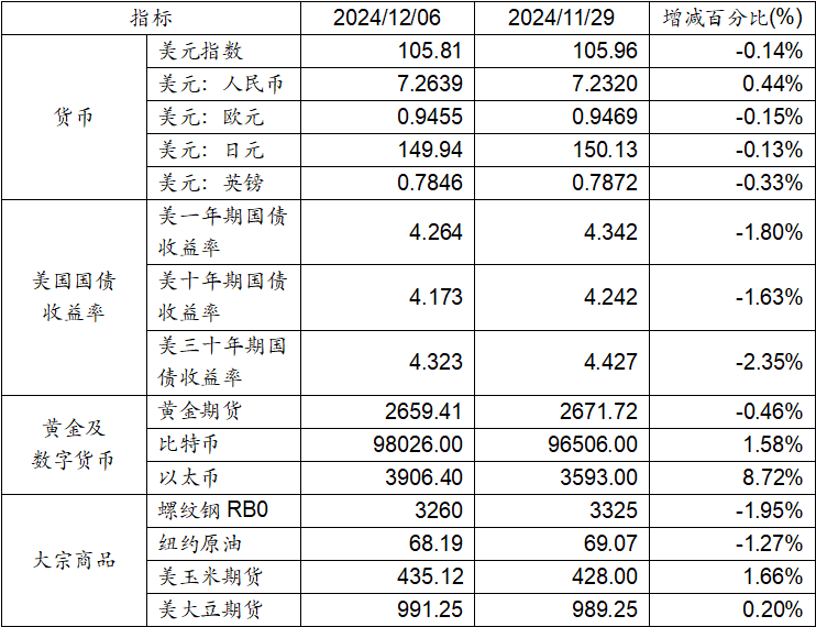 11月29日至12月06日,美元指數下跌0.14%,美元兌人民幣匯率上漲0.44%。美國一年期、十年期及三十年期國債收益率均出現下跌態勢。黃金期貨價格下跌0.46%。比特幣上漲1.58%。以太幣上漲8.72%。大宗商品中紐約原油、螺紋鋼價格下跌,而玉米期貨及大豆期貨價格則呈現上漲態勢。