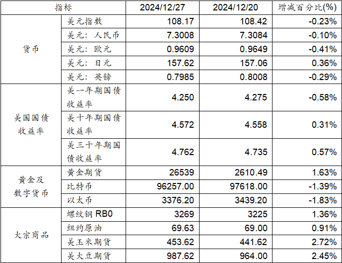 12月20日至12月27日,美元指數(shù)下跌0.23%,美元兌人民幣匯率下跌0.10%。美國(guó)一年期國(guó)債收益率下跌,而十年期及三十年期國(guó)債收益率則呈現(xiàn)上漲態(tài)勢(shì)。黃金期貨價(jià)格上漲1.63%。比特幣下跌1.39%。以太幣下跌1.83%。大宗商品中螺紋鋼、紐約原油、玉米期貨價(jià)格及大豆期貨價(jià)格均呈現(xiàn)上漲態(tài)勢(shì)。