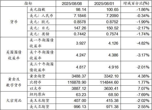 8月1日至8月7日,美元指數(shù)下跌1.86%,美元兌人民幣匯率下跌0.34%。美國一年期、十年期及三十年期國債收益率均呈現(xiàn)下跌態(tài)勢。黃金期貨價格上漲4.38%。比特幣上漲1.77%。以太幣上漲7.07%。大宗商品紐約原油、玉米期貨及大豆期貨價格均呈現(xiàn)下跌態(tài)勢。