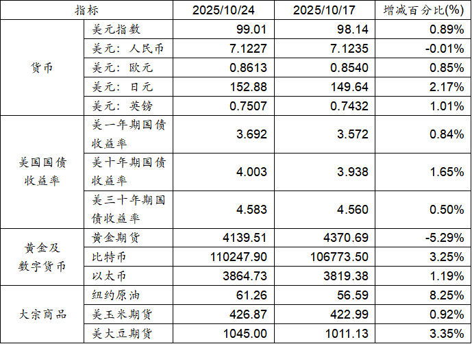 10月17日至10月24日,美元指數(shù)上漲0.89%,美元兌人民幣匯率下跌0.01%。美國一年期、十年期及三十年期國債收益率均呈現(xiàn)上漲態(tài)勢。黃金期貨價格下跌5.29%。比特幣上漲3.25%。以太幣上漲1.19%。大宗商品中紐約原油價格下跌,而大豆期貨及玉米期貨價格呈現(xiàn)上漲態(tài)勢。