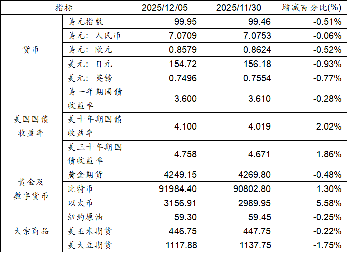 11月30日至12月05日,美元指數(shù)下跌0.51%,美元兌人民幣匯率下跌0.06%。美國(guó)一年期國(guó)債收益率下跌,而十年期及三十年期國(guó)債收益率呈現(xiàn)上漲態(tài)勢(shì)。黃金期貨價(jià)格下跌0.48%。比特幣上漲1.30%。以太幣上漲5.58%。大宗商品中紐約原油、玉米期貨及大豆期貨價(jià)格均呈現(xiàn)下跌態(tài)勢(shì)