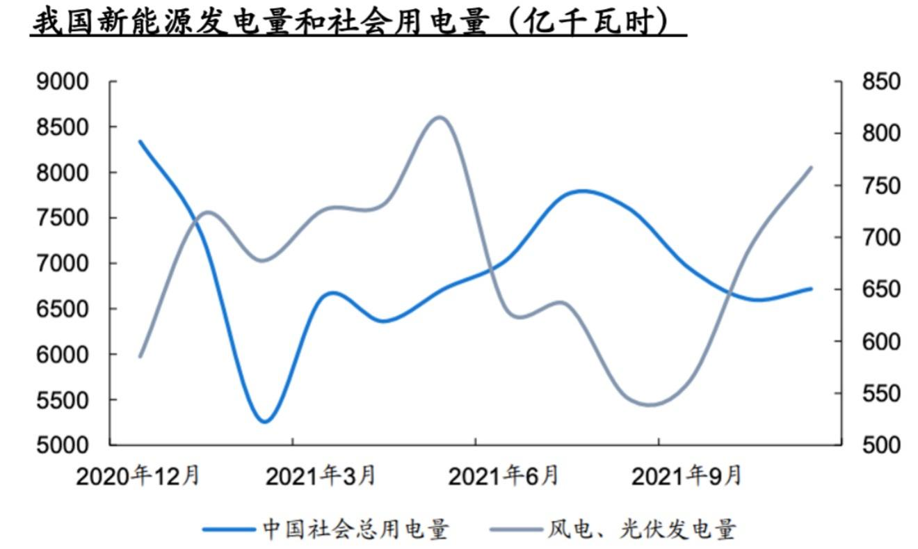 全社會用電量7-9月和12月是高峰,2-4及11月是低谷。而風電和光伏發(fā)電量3-5月及11月是高峰,兩者峰谷錯位。