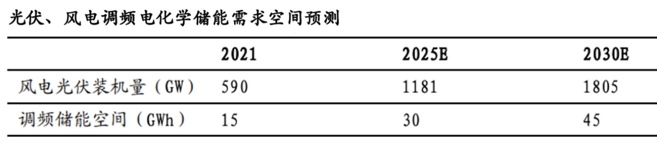 目前火電機組調(diào)頻容量配比為額定功率的2.5%,新能源發(fā)電配比為5%。由此計算得到2025年和2030年的調(diào)頻儲能空間約30GWh和45GWh。