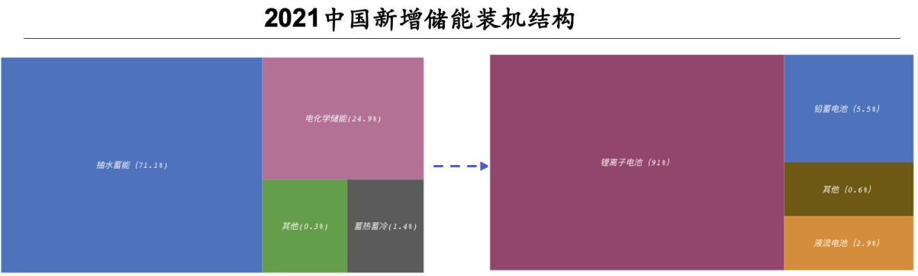 目前,短時儲能的鋰離子電池和長時儲能的抽水蓄能方案在市場中的主導(dǎo)地位非常明顯。根據(jù)《2022儲能產(chǎn)業(yè)應(yīng)用研究報告》的數(shù)據(jù),在2021年中國新增儲能裝機結(jié)構(gòu)中,抽水蓄能占據(jù)71%的份額,而在新裝機的電化學儲能中,鋰離子電池占據(jù)了91%的份額。