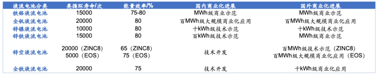 根據(jù)電極活性物質(zhì)的不同,可分為全釩液流電池、鐵鉻液流電池、鋅溴液流電池、鉛酸液流電池等。其中全釩液流電池商業(yè)化進展最快,鐵鉻、鋅溴還在商業(yè)化初期。