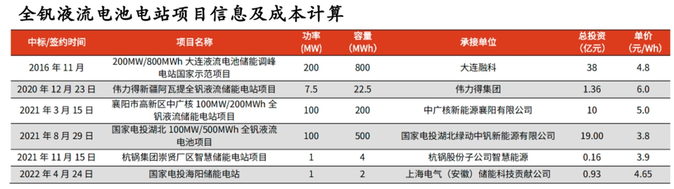 釩電池目前最為人詬病的就是其高昂的初裝成本(比鋰電池高一倍),根據(jù)已有的全釩電池電站項目信息可以算出,項目總投資成本集中在3.8-6元/Wh。與之相比的鋰電池單位投資成本約2元/Wh。