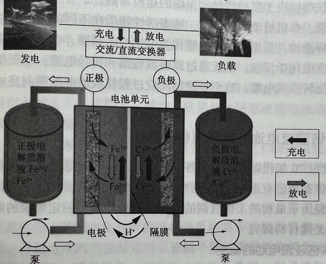 充放電過程中,電解液通過循環(huán)泵進入兩個半電池中,F(xiàn)e3+/Fe2+電對和Cr3+/Cr2+電對分別在電極表面進行氧化還原反應(yīng),正極釋放電子通過外電路傳遞到負極,電池內(nèi)部通過離子在溶液內(nèi)移動,并與離子交換膜進行質(zhì)子交換,形成完整回路。