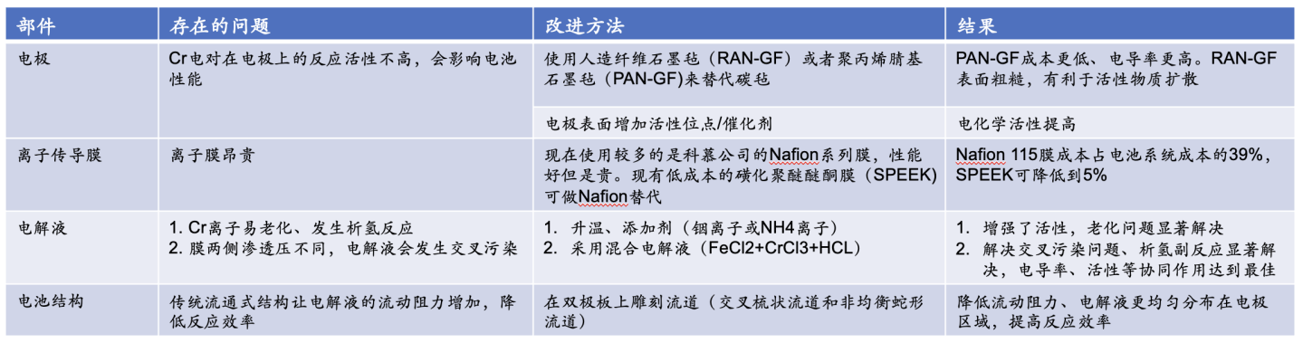 1. 鉻離子在電極上的反應(yīng)活性不高,導(dǎo)致能量密度比較低。解決的辦法是采用人造纖維石墨氈(RAN-GF)或者聚丙烯腈基石墨氈(PAN-GF)來替代碳氈。兩種方式各有優(yōu)勢,具體哪種更好目前沒有定論。